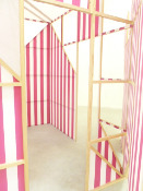 - Peinture sur/sous verre n° 15 recouvrant un tissu rayé blanc et rouge découpé, Juin 1983-juillet, 1985,