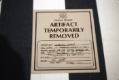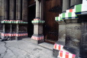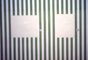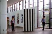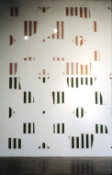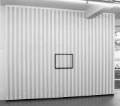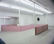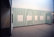 - Peinture acrylique blanche sur tissu rayé blanc et marron : Rideau, Avril, 1975, Travail in situ