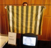 - Peinture acrylique blanche sur tissu rayé blanc et rouge, Octobre, 1969,