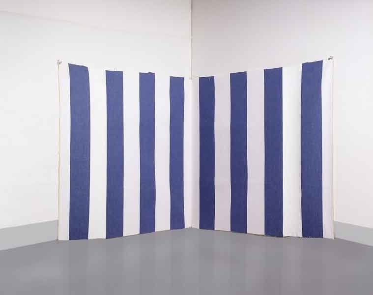 - Peinture acrylique blanche sur tissu rayé blanc et bleu, Octobre, 1970,