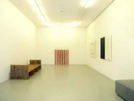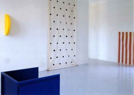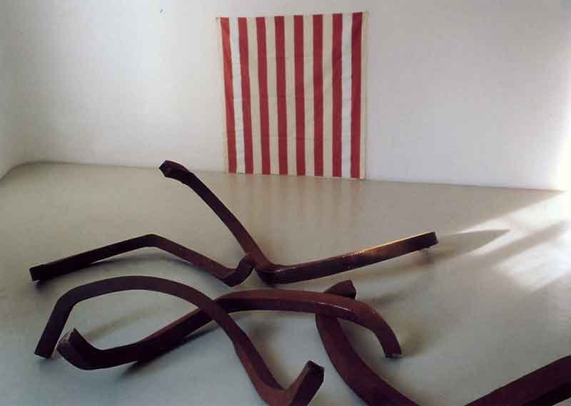 - Peinture acrylique blanche sur tissu rayé blanc et rouge, Août, 1970,