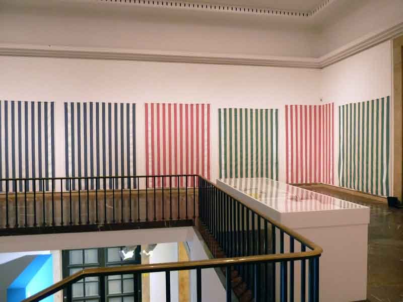 - Peinture acrylique blanche sur tissu rayé blanc et bleu, Septembre, 1970,