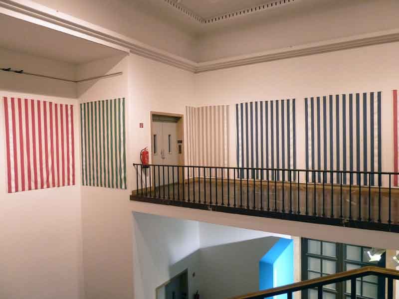 - Peinture acrylique blanche sur tissu rayé blanc et coloré, Juin, 1969,