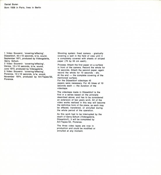 - Vidéo-souvenir : Recouvrement / Effacement : 12 x 10', Novembre, 1974,