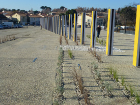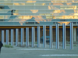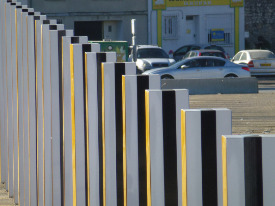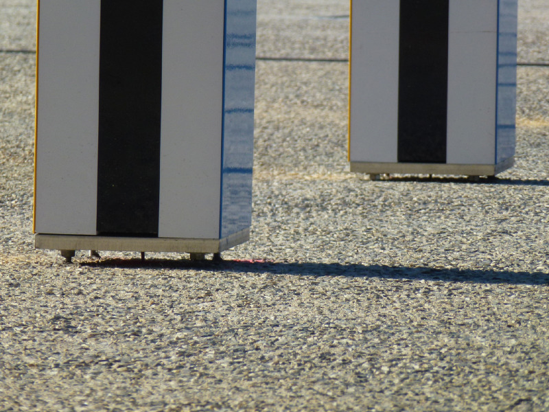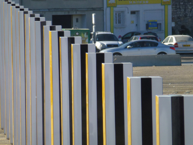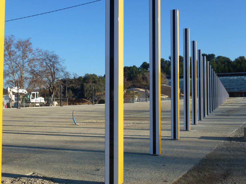 - La Grande Diagonale, travail in situ permanent pour deux couleurs plus le blanc et le noir. 57 piliers de 114 à 505 cm de hauteur, Décembre, 2013, Travail in situ permanent