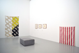 - Peinture acrylique blanche sur tissu rayé blanc et rouge, Août, 1970,