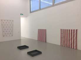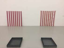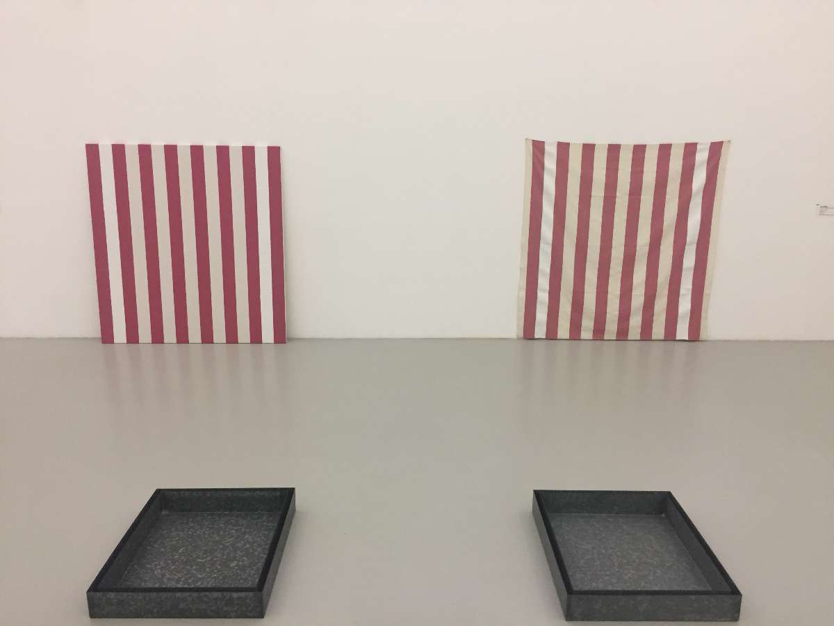 - Peinture acrylique blanche sur tissu rayé blanc et rouge, Août, 1970,