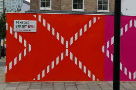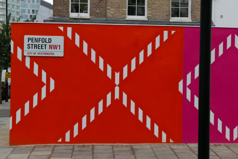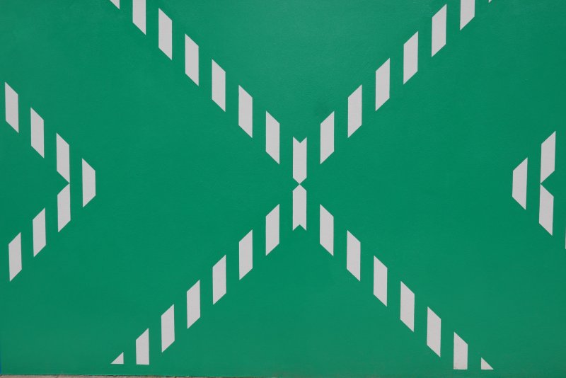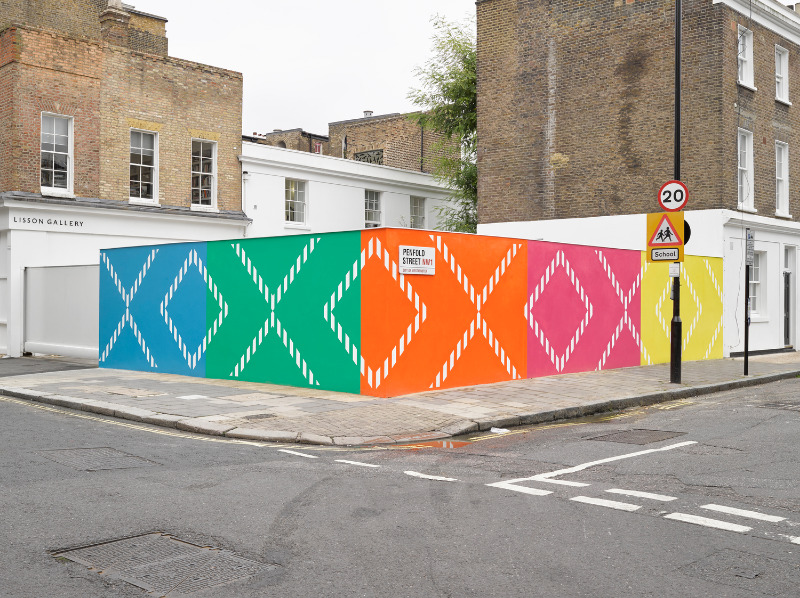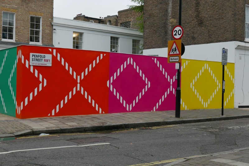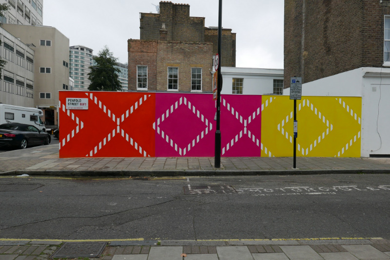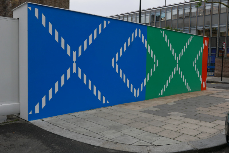 - Palissade polychrome sur 2 rythmes, avec formes blanches, 2014-septembre, 2017, Travail in situ