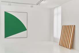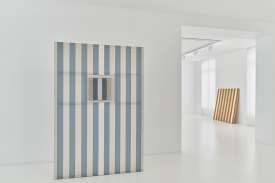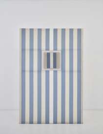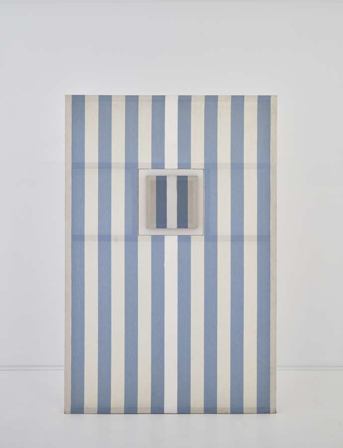 - Peinture acrylique blanche sur tissu rayé blanc et orange, Avril, 1969,
