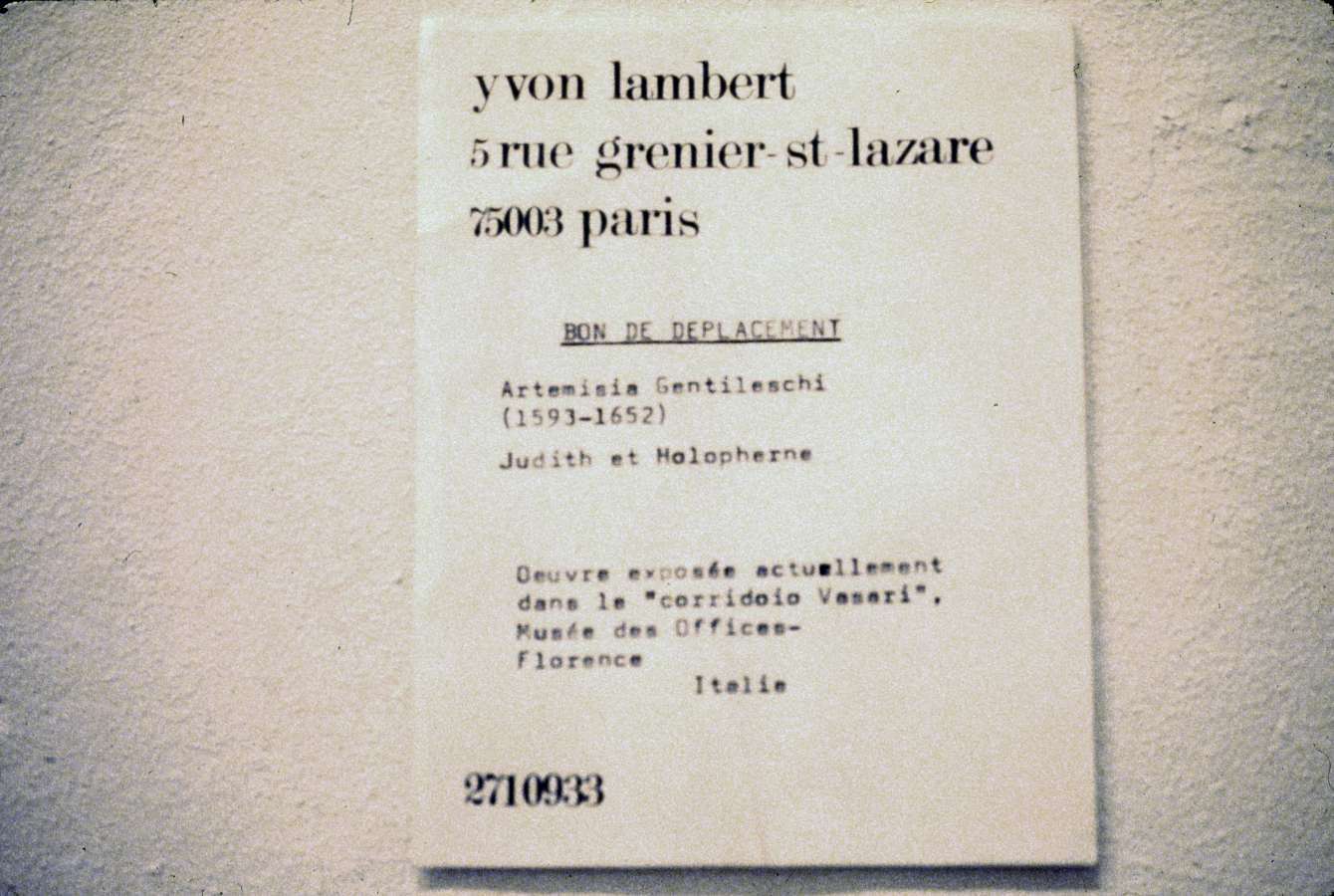 "Artemisia - Daniel Buren, Sarah Charlesworth, Douglas Huebler, Joseph Huebler, Joseph Kosuth, Jannis Kounellis, Joan La Barbara, Lea Lublin, Duane Michals, Giulio Paolini, Eve Sonneman, Cy Twombly, Michèle Zaza"