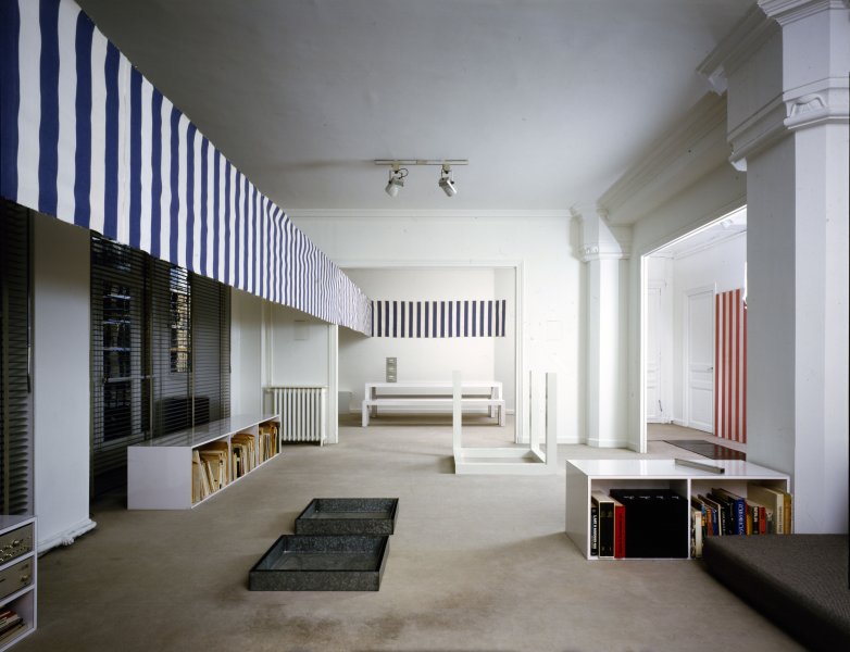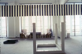 - Peinture acrylique sur tissu rayé blanc et rouge, Mai, 1969,