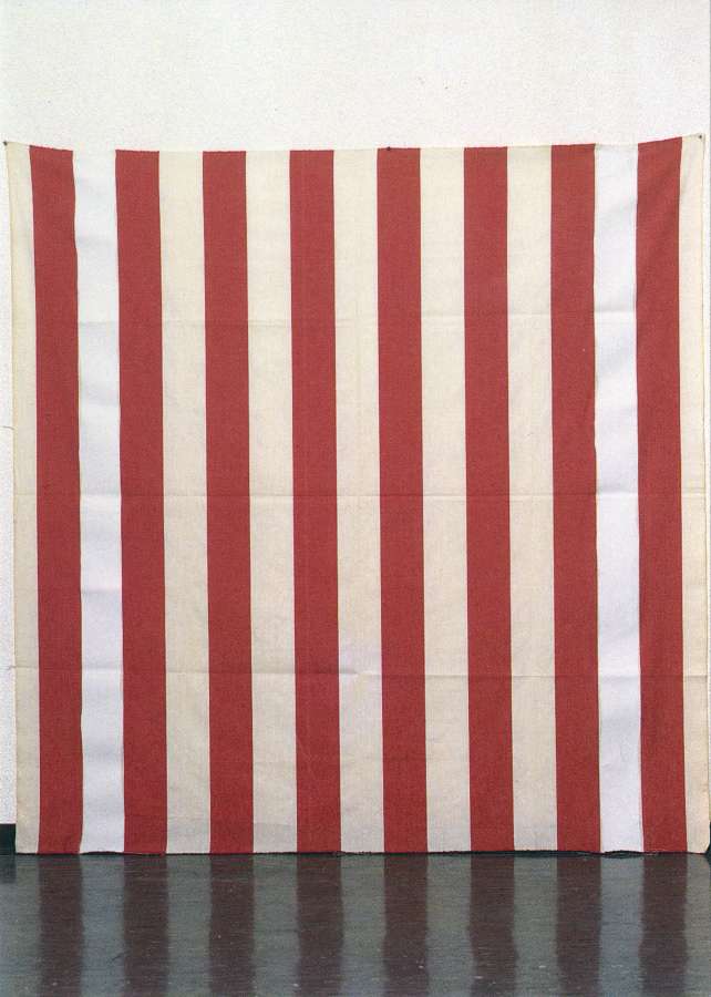 - Peinture acrylique blanche sur tissu rayé blanc et rouge, Août, 1970,